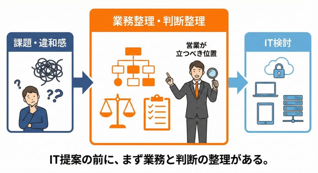 ここを一緒に整理できる営業は、「売りに来た人」ではなく「一緒に考える人」になります。